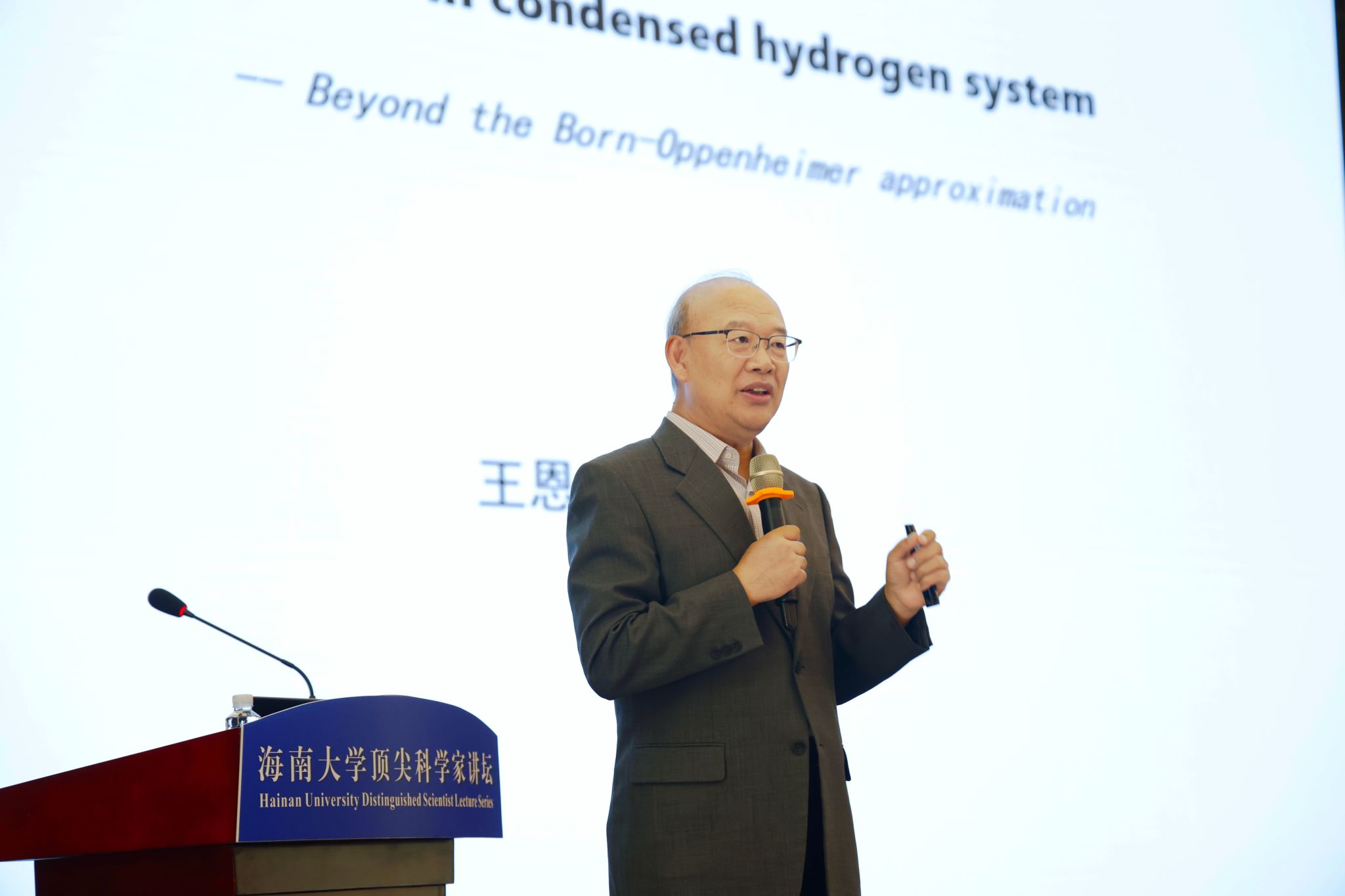 On October 15, the 45th HNU Distinguished Scientist Lecture was held at the auditorium of the Social Sciences Complex. Prof. Wang Enge, a member of the Chinese Academy of Sciences (CAS), delivered a keynote lecture titled “Full Quantum Effects in Condensed Hydrogen System--Beyond the Born-Oppenheimer Approximation.” In attendance were Xu Wei, Vice Chairman of the Hainan Association for Science and Technology; HNU President Luo Qingming, also Member of CAS; and other HNU leaders, including Gao Diangong, Qiu Xiguang, Chen Jun, and Nie Zongxiu. President Luo Qingming presided over the event.