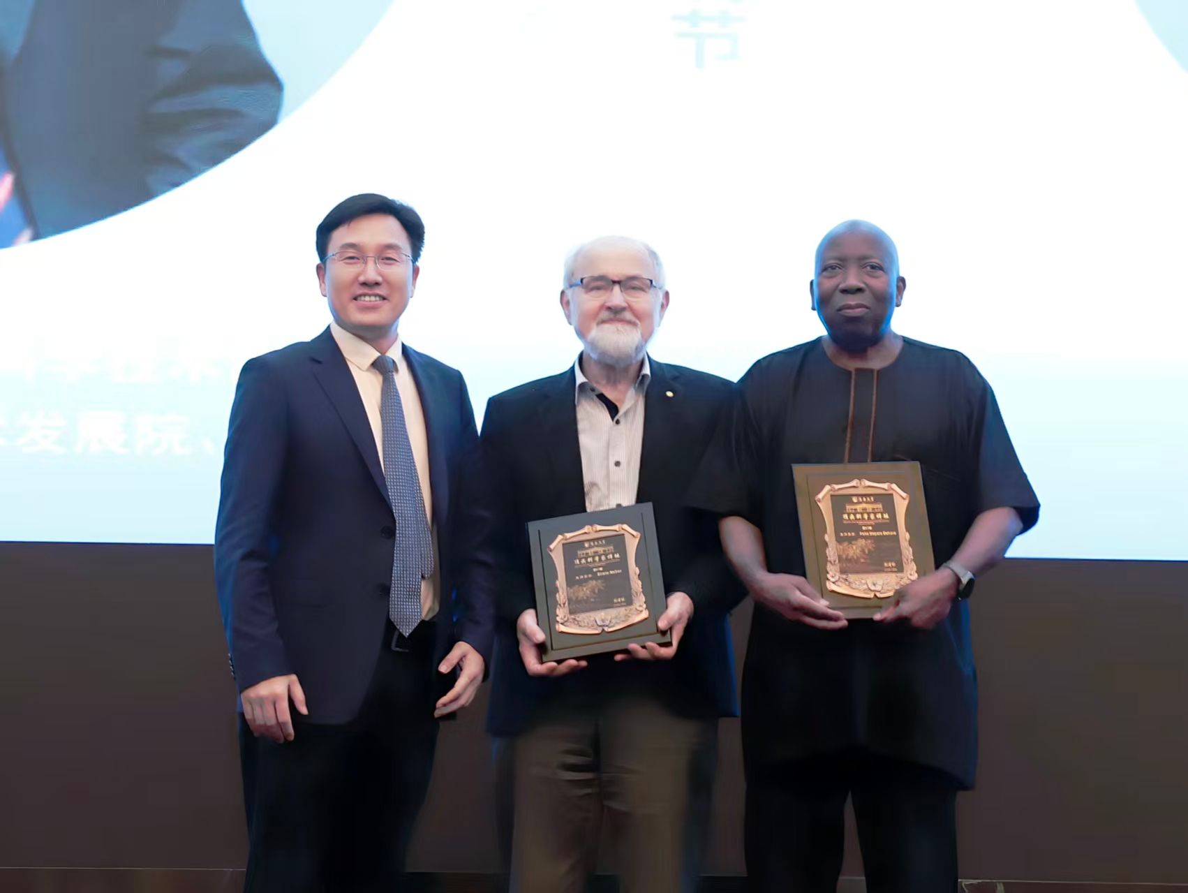 On the afternoon of November 6, the 47th Hainan University Distinguished Scientist Lecture Series is held at the lecture hall on the second floor of the Social Sciences Building. Chen Jun presents commemorative plaques to Professors Erwin Neher and Felix Dapare Dakora. (Photo by Chen Sitian)