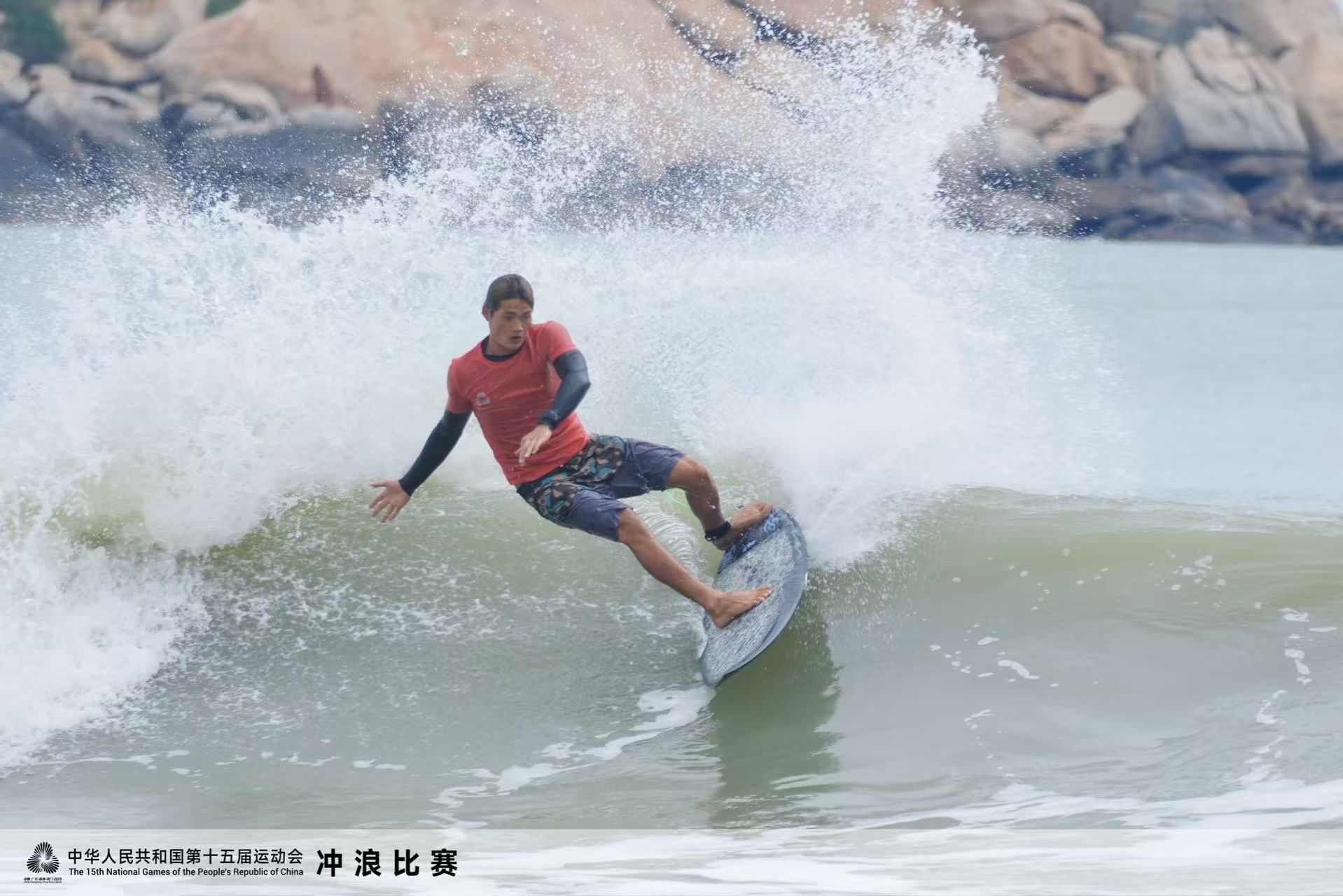 From November 13 to 16, 2025, the surfing event of the 15th National Games was held in Aonan, Guangdong. This is Wang Chengzheng competing in the event. (Photo by School of Physical Education, Hainan University)