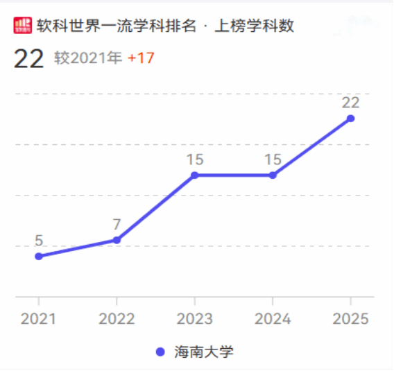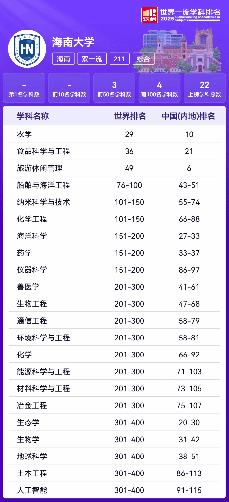 On November 18, 2025, Shanghai Ranking, a renowned higher education evaluation agency, released this year’s edition of the Global Ranking of Academic Subjects (GRAS). Hainan University has 22 subjects listed in the ranking, placing it 53rd in China by the total number of entries. This marks a staggering 340% increase from the 5 subjects in 2021.