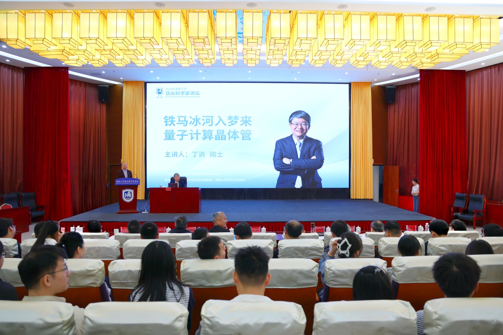 On the morning of December 31, the 55th Distinguished Scientist Lecture was held in the lecture hall of the Social Sciences Building at Hainan University. Ding Hong, a member of the Chinese Academy of Sciences and Chair Professor at the Tsung-Dao Lee Institute, Shanghai Jiao Tong University, delivered a keynote report titled “Steel steeds and frozen stream in my dreams: Quantum Computing Transistors”. Li Hu, Chairman of the Hainan University Council, Luo Qingming, Member of Chinese Academy of Sciences and President of Hainan University, Zhang Jiyou, Executive Deputy Chair of HNU Council, and other HNU leaders were in attendance.