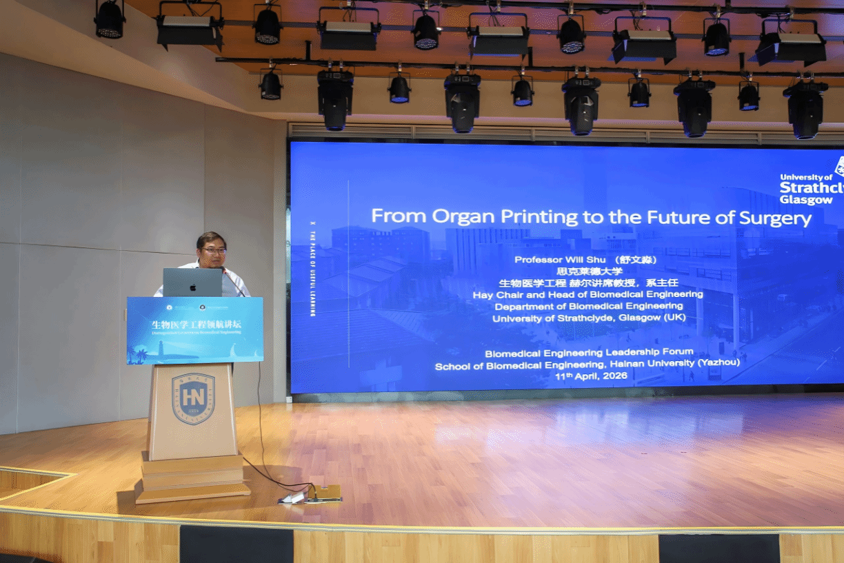 On the afternoon of April 11, Campbell Booth led a delegation to the School of Biomedical Engineering at Hainan University. During the visit, Mr. Shu Wenmiao, Head of the Department of Biomedical Engineering in Strathclyde, delivered a keynote lecture in the BME Frontier Forum. President Luo Qingming accompanied the delegation and attended the session.
